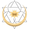 JUSOMA - Julia Sophia Mai - Logo. Ein weißer liegender Halbmond mit einer weißen Lotusblüte in der Mitte, umgeben vom weißen geometrischen Linien und dem Text 'Julia Sophia Mai' und 'Holistic Health Consultation and Coaching'.